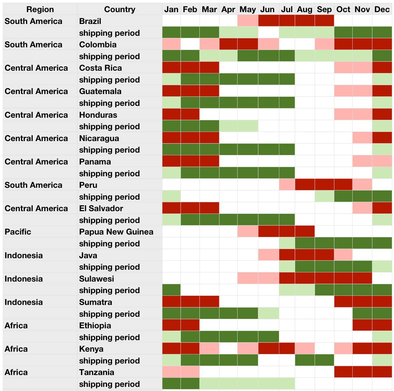 We’ve dedicated ourselves to transforming our experience of coffee from a generic commodity to a really special beverage, and treat it more like fresh produce than some faceless staple. . . This understanding of coffee as produce has wonderful implications: it lets us think of coffee as a fresh, artisan-crafted food, with all the delicious experience that brings. However, many in the coffee industry are unaware that, like all produce, coffee is a distinctly seasonal crop.